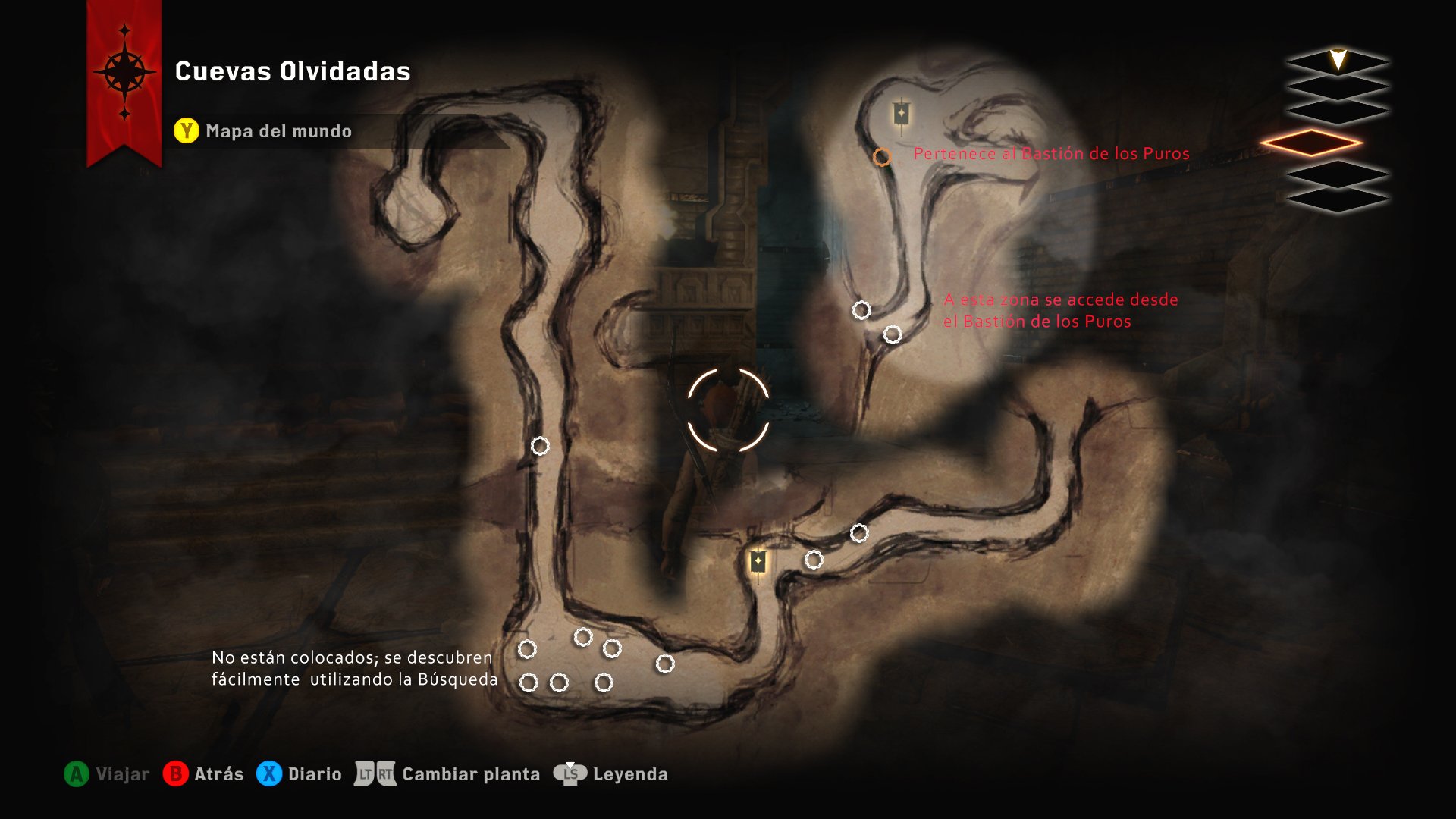 Vemos las marcas de las cuatro estructuras que hemos de destruir. Las seguimos, y cerca de cada una de ellas, nos atacan más qunari. En algunos sitios, el espacio es muy reducido, por lo que conviene salir a espacios más amplios para facilitar el combate. También nos atacarán, según bajamos hacia las estructuras más profundas, Asesinos invisibles. Dado lo estrecho de estos lugares, es fácil que nos sorprendan y acaben con algún miembro del grupo. Si estamos atentos al radar, ahí se marcan los puntos rojos, lo que nos da cierta ventaja para atacarlos antes de que lo hagan ellos.