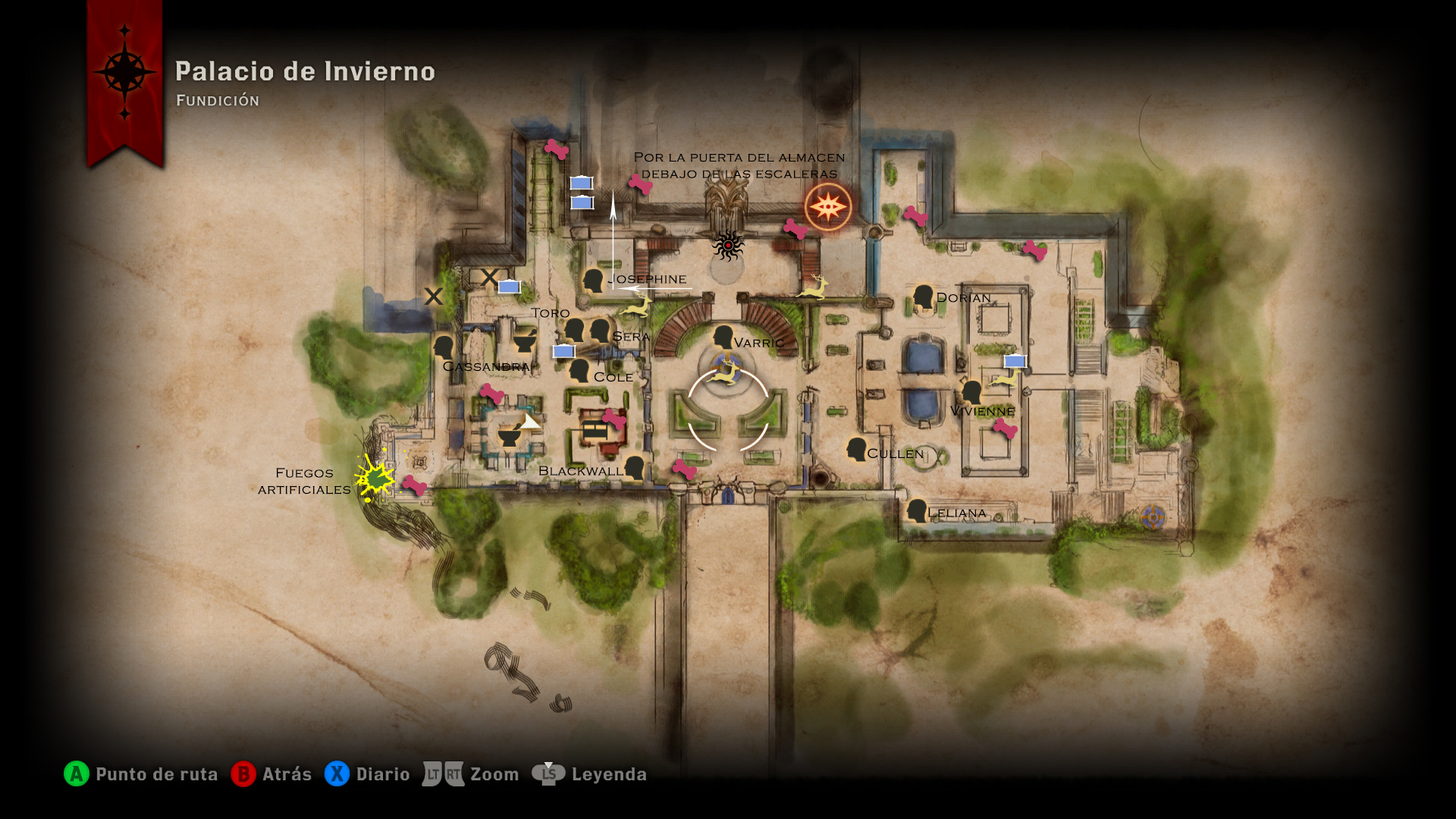 Nota: Es fácil que hayamos recogido ya alguna «chuche cara para perro», lo que habrá desbloqueado esa misión secundaria. Hay cuatro más para hacer dentro del recinto del palacio, que indico en la tabla de abajo.