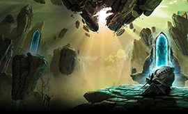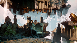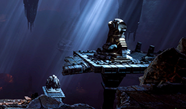 Estamos en el Retiro del Erudito. Subimos las escaleras y llegamos a una sala con grandes murales en las paredes. Leemos lo que hay encima de la mesa y bajamos por unas escaleras que están al lado de los soportales (en estos, está la inscripción del puzle). Activamos el dispositico en forma de huevo y vemos cómo grandes losas vuelan formando otro tramo de escaleras.