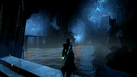 Bien, nos adentramos en el espejo; estamos en un pasillo en el que, al fondo, vemos otro cadaver. Subimos unas cortas escaleras y vemos con sorpresa varios cadáveres de qunari calcinados. Si vamos a la parte trasera, vemos un cofre protegido por unas llamas púrpura. Si intentamos cruzarlas nos matan, así que lo dejamos para cuando podamos cruzarlas con seguridad. Pasamos otro espejo. Nos encontramos en «Las Ruinas de las montañas élficas». Decidimos investigar qué ha sucedido y lo cruzamos. Vemos un puente cortado y, al fondo, más qunari. Bajamos por las escaleras de la izquierda y cruzamos otro espejo. Nos topamos con unos espíritus de elfos que nos hablan en la antigua lengua élfica. Si el personaje principal bebió del Pozo de las Penas, aparecerá un diálogo especial, «Escuchar al Pozo de las Penas»; lo utilizamos y los espíritus nos dejan pasar. Si fue Morrigan la que bebió, no tenedremos más remedio que luchar contra ellos. Rodeamos por la izquierda y, abajo de las escaleras, vemos un cofre protegido por una barrera de llamas púrpura, que dejamos para más tarde. Nos acercamos ahora a un mosaico que cierra la entrada y lo examinamos; se disuelve y, a la vez, nos dice que ese valle fue creado por Fen'Harel para refugiar y proteger a los esclavos.