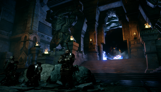 Desandamos el camino y regresamos a la Torre Derruída. Abajo nos atacará un grupo de qunari. Acabado con ellos, es el momento, si queremos, de hacer el puzle, pues ya no nos volverán a atacar aquí abajo.