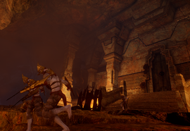 Nota: Aquí, en la Armería escondida, hay un magnífico tesoro que podemos ver detrás de una puerta de rejas y al cual no podemos acceder en este momento. Una vez la marca de nuestra mano haya alcanzado su máximo poder, debemos volver, pero en vez de entrar en el Santuario Olvidado, rodeamos por su izquierda hasta casi el final (para no hacer todo el camino, podemos entrar por el elvuian que lleva directamente a la armeria, subir las escaleras y saltar por el balcón del fondo). Nos acercamos al borde hasta encontrar un camino, lo seguimos y encontramos una cueva bloqueada con grandes piedras y varios barriles de gatlock. Los detonamos con la habilidad adquirida y desbloqueamos la entrada. El tesoro consiste en 200.000 de oro y algunas cosas más de valor . Sabroso, ¿no?